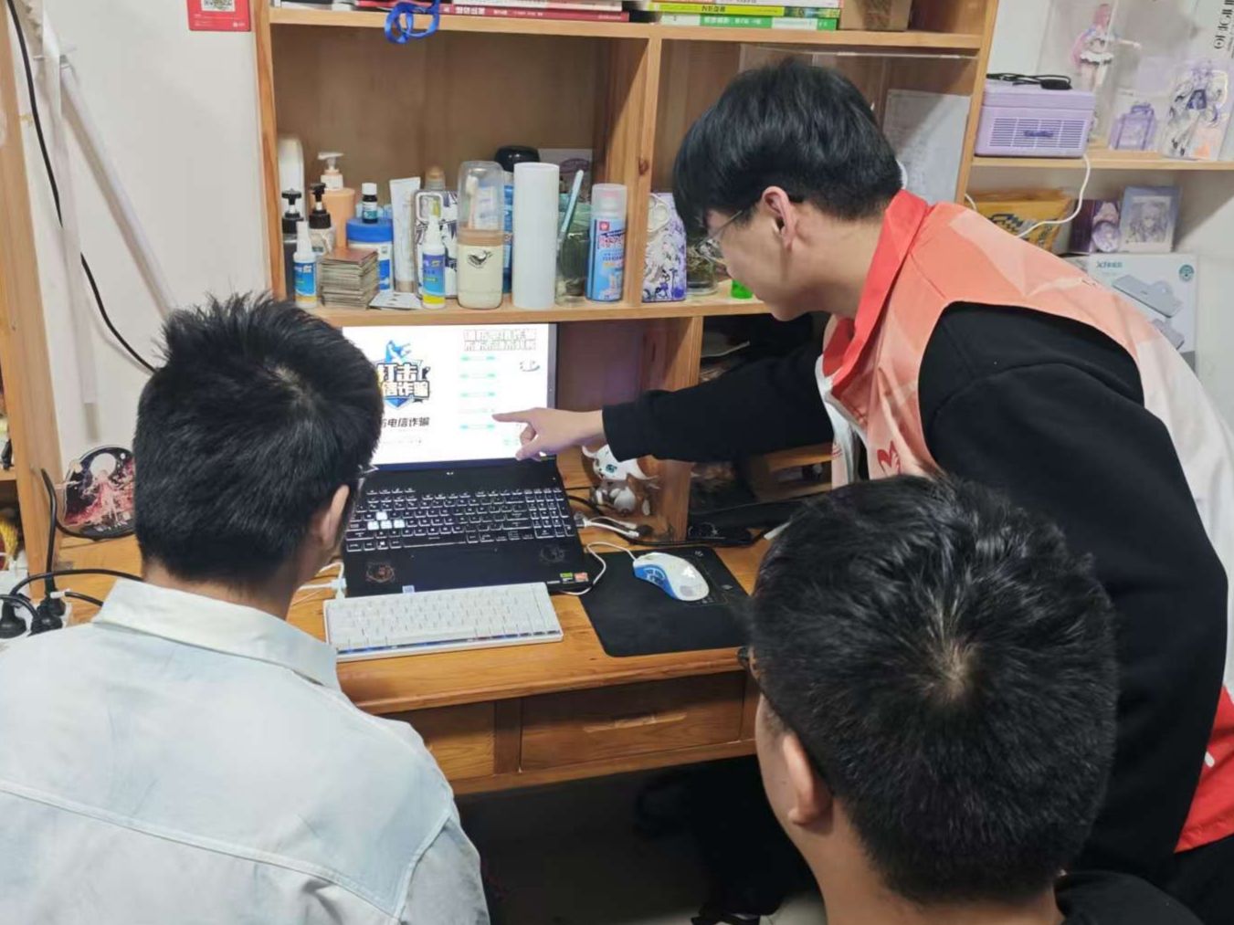 实战模拟:志愿者深入宿舍演练。学校组织志愿者走进学生宿舍,开展模拟网络诈骗场景的实景演练,让学生直观感受其危害、提升防范能力。志愿者们精心设计了虚假中奖、网络交友诈骗、冒充公检法诈骗等多种常见情境进行逼真模拟。同学们通过沉浸式参与,深刻认识到网络诈骗的多样性与隐蔽性,掌握了实用防骗技巧,有效增强了自我保护能力。