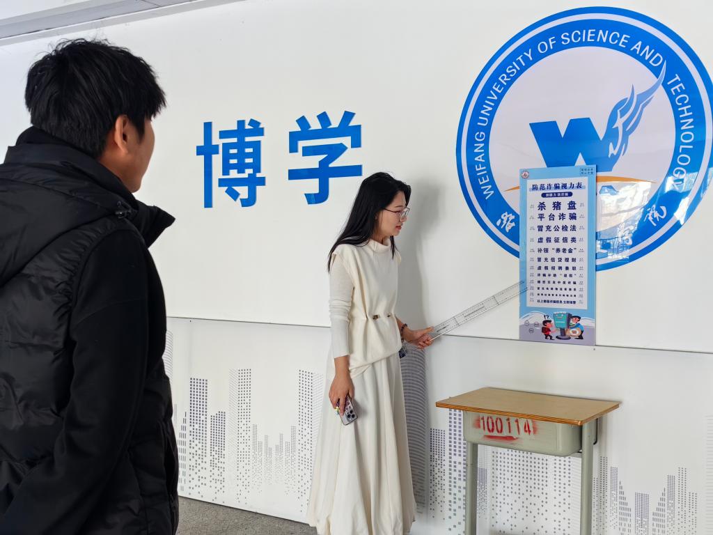 在“寓教于乐反诈视力表”活动现场,精心设计的视力表,将“刷单返利”“校园贷”等高发诈骗套路巧妙融入测试内容,学生在模拟测视力的过程中,轻松认读诈骗关键词、牢记反诈核心要点。团总支书记闵晓妍现场指导,并且结合高校高发诈骗案例,逐一向大家拆解诈骗陷阱,剖析受骗诱因,将枯燥生硬的反诈知识转化为生动易懂的实操指南,有效提升学生的识诈、防诈、反诈意识和能力。
