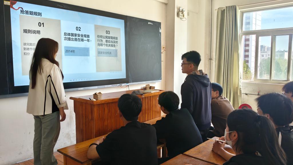 国家安全知识竞赛火热开展,设置必答题、抢答题、风险题多重环节,还创新加入“你来比划我来猜”国安词汇互动。同学们组队比拼,在紧张有趣的角逐中巩固国家安全知识,将法律法规、安全准则内化于心,切实提升安全素养。